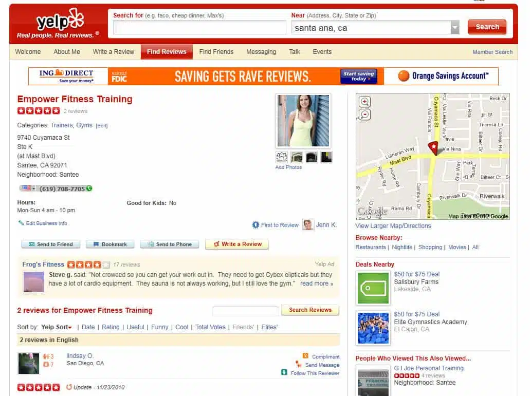 • Post your own photos, add detailed descriptions about the business and owner, update any incorrect information, and spread the good review karma by leaving positive and honest reviews of other businesses you like in the area. Empower Fitness Training in Santee, CA, does a wonderful job in owning its profile. Owner Kari has filled out the “About This Business” section with informative descriptions, made recommendations of other San Diego businesses, and added quality photos of the gym. This gym may be on the smaller side, but it packs a huge punch on Yelp.com and her efforts have paid off – 5 stars on Yelp.com!